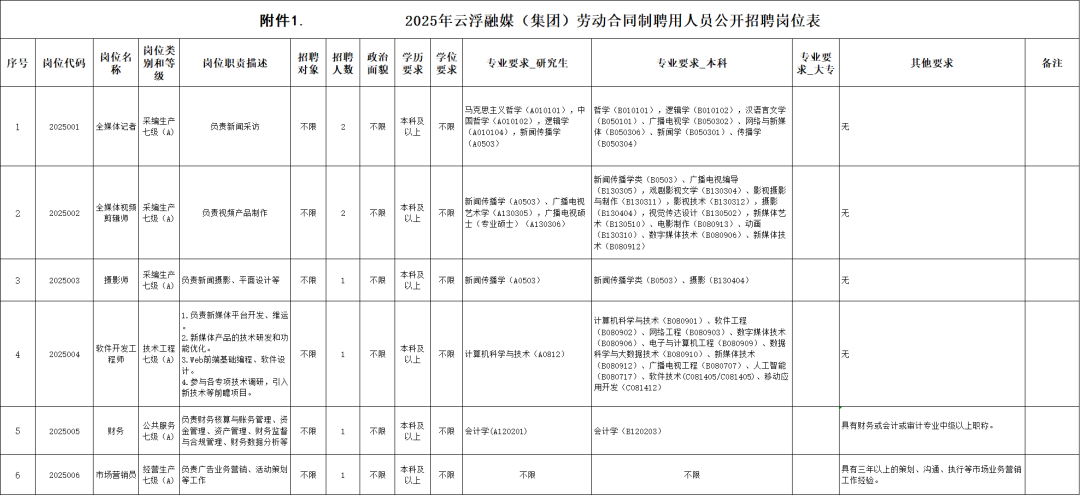 本次招聘工作人员共8名,其中:云浮市融媒体中心招聘全媒体记者2名;云浮融媒集团有限公司招聘全媒体视频剪辑师2名,摄影师1名,软件开发工程师1名,财务1名,市场营销员1名。具体招聘岗位要求详见《2025年云浮融媒(集团)劳动合同制聘用人员公开招聘岗位表》(附件1)